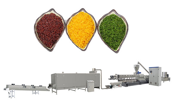 The production line uses rice flour, corn flour, buckwheat flour, Konjak flour, etc. as the main raw materials, and can add vitamins, minerals and other nutritional elements to produce nutritionally fortified rice. The mixed powdery material is matured by a rice extruder, extruded and granulated, then dried at low temperature and cooled to make artificial rice with various shapes and tastes. This processing technology not only retains the original ingredients of ordinary rice, but also supplements and strengthens the nutrients necessary for human health. The nutritional rice production line can not only produce nutritious rice such as miscellaneous grain rice, golden rice, konjak rice, green bamboo rice, but also artificial lentils, couscous rice and other foods.